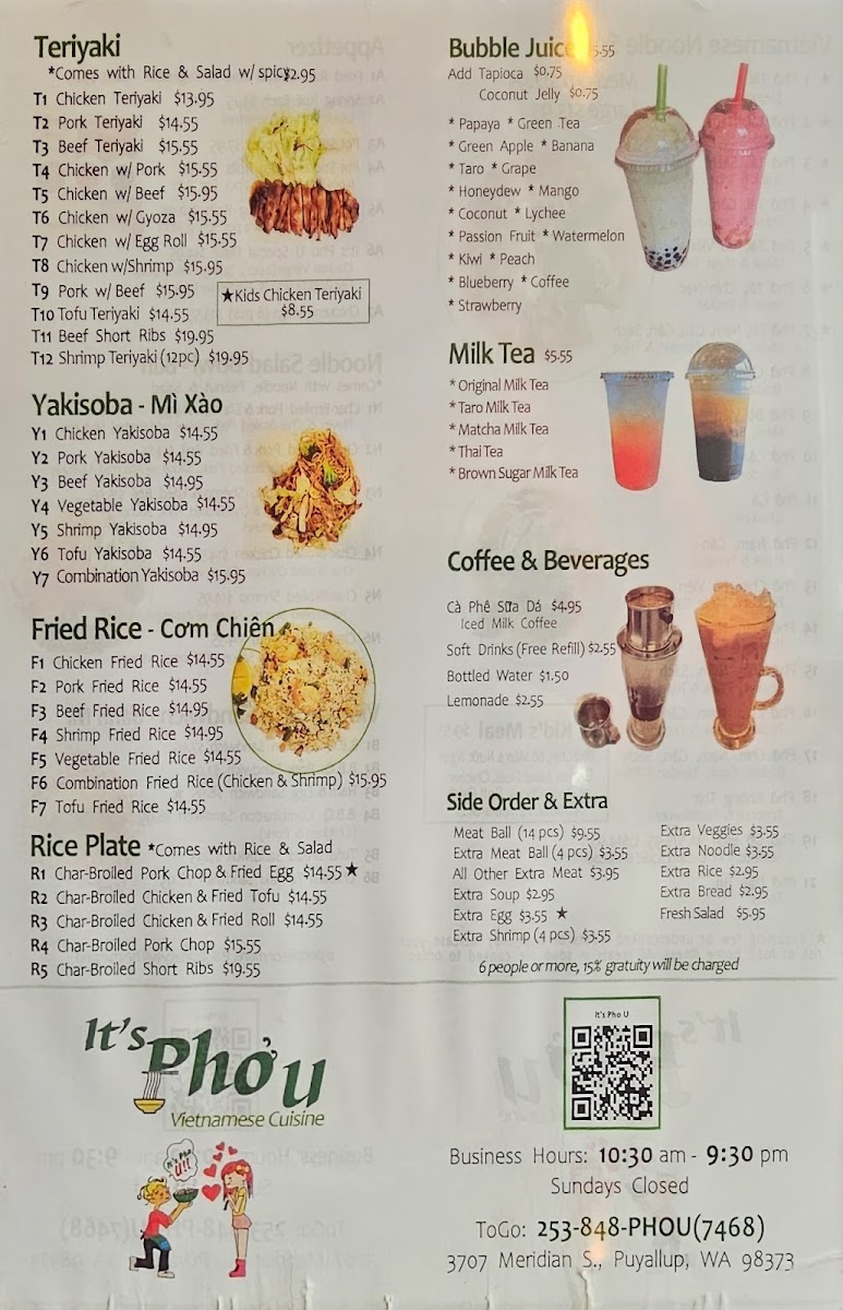 Welcome to It's Pho U, a delightful Vietnamese eatery located in the heart of Puyallup, WA. This cozy restaurant features a menu filled with authentic dishes that promise a taste of Vietnam right in your neighborhood. Start your meal with crispy Chicken Wings or Fried Rolls, each meticulously prepared to satisfy your cravings.